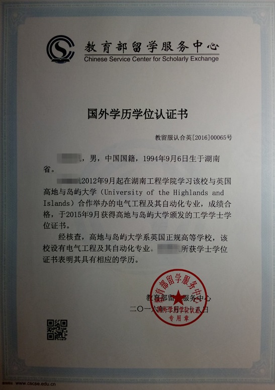 学生英语成绩达到要求,末,可注册为高地与岛屿大学海外学生。第三年修完专业课程后,学生成绩合格可获得高地与岛屿大学的电气及电子工程普通学士学位或机械工程普通学士学位。所获学位为中英两国政府及国际承认。
