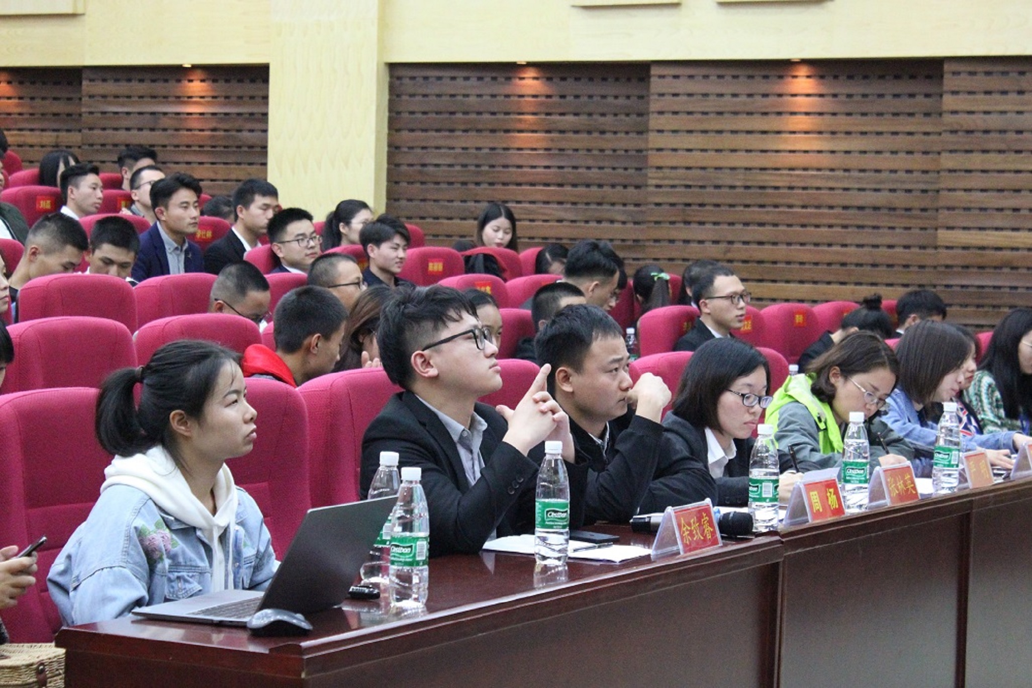 比赛伊始,大赛主持人致开场词并介绍到场的各位评委及嘉宾。出席本次应聘模拟大赛的评委有福建锦江科技有限公司人力资源部招聘经理——张林英、艾莱依集团培训与人才发展经理——余致睿、上海高顿教育培训有限公司招聘主管——周杨、招生与就业指导处副处长——严明、理学院副书记——陈亚琼。