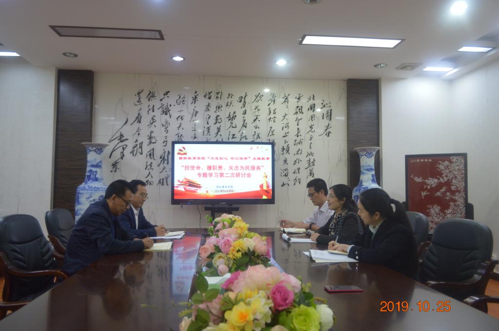 10月25日下午,1946伟德国际源自英国(国际交流中心)在院会议室E105开展开展“不忘初心、牢记使命”主题教育——“担使命、履职责,矢志为民服务”第二次专题学习研讨。会议由党总支书记苏哲民主持,全体教工党员参加会议。