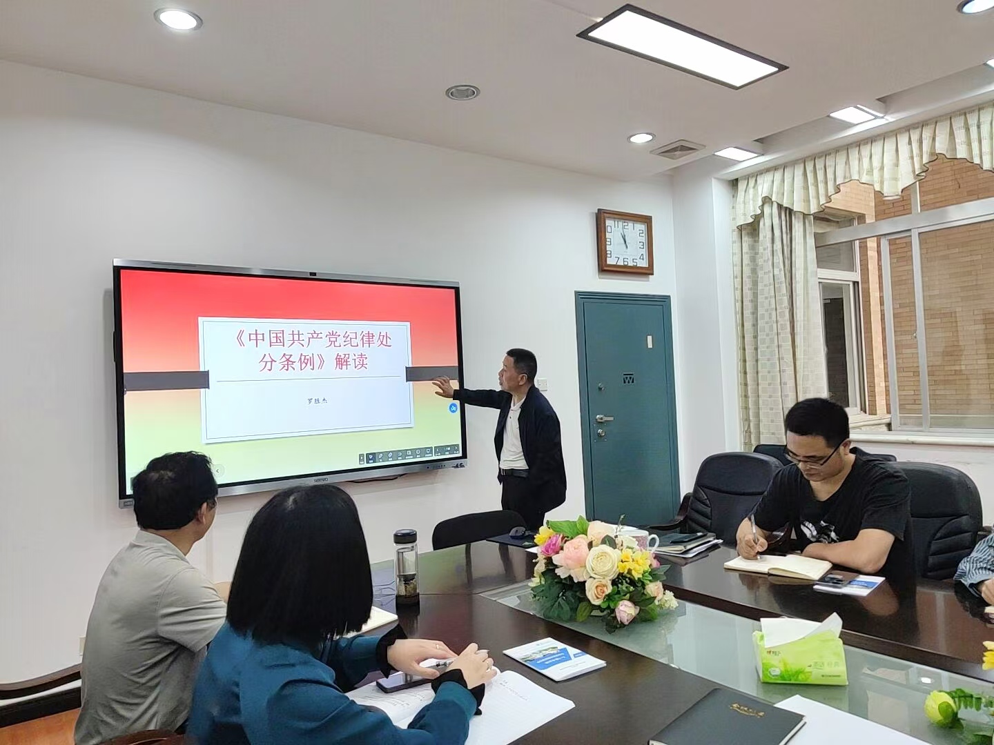 罗胜杰为大家带来了“《中国共产党纪律处分条例》解读”主题微党课。党课着重介绍了政治纪律、组织纪律、廉洁纪律、群众纪律、工作纪律和生活纪律方面的内容及修订情况。罗胜杰提醒全体党员把学习贯彻《条例》作为重要政治任务,以严明的纪律推进党的自我革命。他结合学校工作要求,带领全体教职工学习了《伟德bv1946本科教育教学审核评估知识手册》,号召全体同仁提高思想认识,不断加强学习;多效协同联合,不断强化主人翁意识;多方齐抓共管,不断推进行动落实。