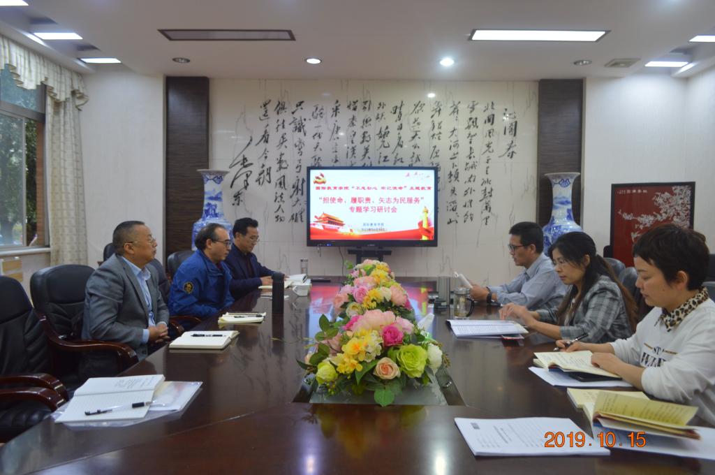 10月16日上午,1946伟德国际源自英国(国际交流中心)在院会议室E105开展开展“不忘初心、牢记使命”主题教育——“担使命、履职责,矢志为民服务”第一次专题学习研讨。会议由党总支书记苏哲民主持,全体教工党员参加,学校督导七组副组长胡爱卿到会指导。
