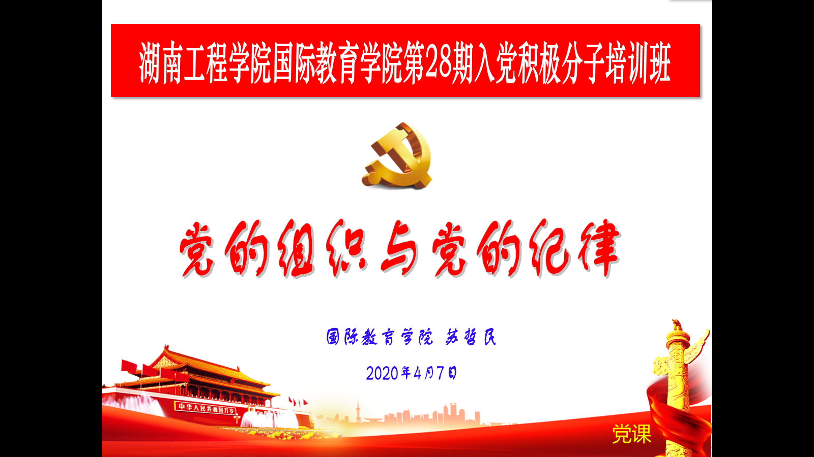 2020年4月7日晚7:00,1946伟德国际源自英国党总支书记苏哲民为学院分党校第28期入党积极分子培训班学员讲授了一堂 “党的组织与党的纪律”党课。