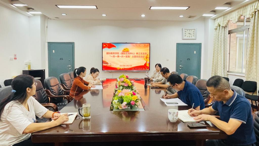 为热烈庆祝中华人民共和国成立74周年,深入学习贯彻习近平新时代中国特色社会主义思想和党的二十大精神,进一步发挥党组织政治引领和党员先锋模范作用,10月24日下午,1946伟德国际源自英国(国际交流中心)教工党支部在E105会议室举行“一月一课一片一实践”主题党日活动。活动由支部书记林愿主持,支部全体党员参加。