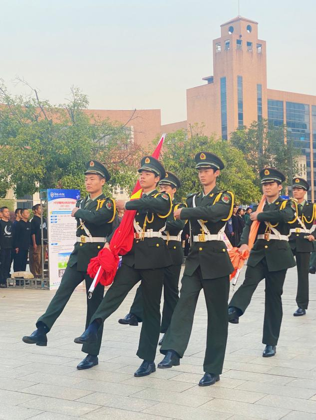 随着“请全体肃立,迎国旗!”号令声响,国旗仪仗队迎着朝阳,目光坚毅,踏着铿锵步伐,以昂首挺胸的姿态将国旗稳步送至升旗台。伴随雄壮的国歌,掣旗手振臂扬旗,鲜艳的五星红旗迎风飘扬,在阳光下熠熠生辉。