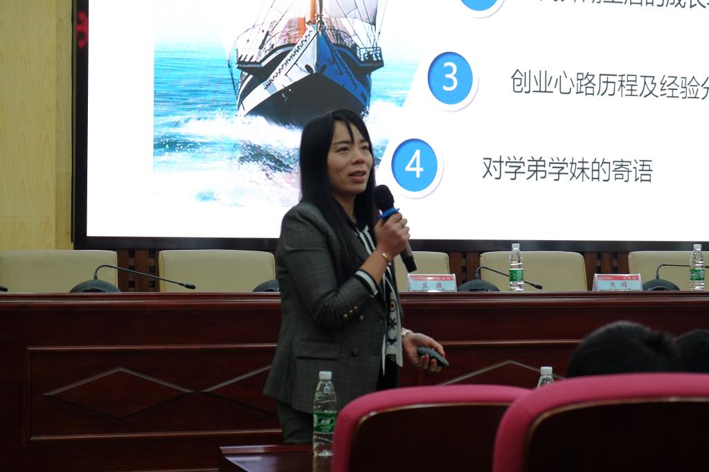 周娟校友分享了湖工大学生活留给自己的人生财富,提醒同学们在大学阶段要有意识地培养和锻炼自己,不仅要吃透每门课程的知识和技能,做到学以致用,还要注重全面提升自己的素养和能力,学会待人接物、文明礼仪等做人的基本道理。她还用自己离开湖工后的成长和创业经历为例,勉励同学们勇于开拓创新,善于抓住机遇,敢于迎难而上,扬起理想的风帆,砥砺前行。