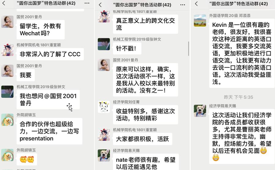 “这是我入校以来参加的最特别的活动,没有之一!” “这是真正意义上的跨文化交流!” “今天是我第一次与外籍老师近距离交流,我要好好练习英语口语!” “原来还可以这样开展活动,超爱!我要去看世界!”会后,同学们仍然兴趣盎然,激动地在微信群留言,表示对此次活动的充分肯定。