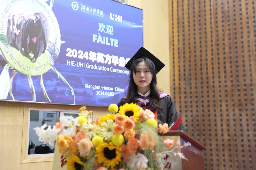 Veronica Lynch博士致辞。她热烈欢迎所有毕业生加入UHI校友大家庭,并欣喜地分享了UHI近年来荣获的新成就。她把两校的合作办学机制、家庭、社会比喻成一个紧密相连的生态系统,这个系统给予了青年学子精心的呵护和全力的支持,让他们从小树苗茁壮成长为参天大树。她希望毕业生们珍惜大学的土壤、家庭的华盖、产业的布局,向下扎根,向上生长,成为卓越的知识管家、思想传播者及工程师。