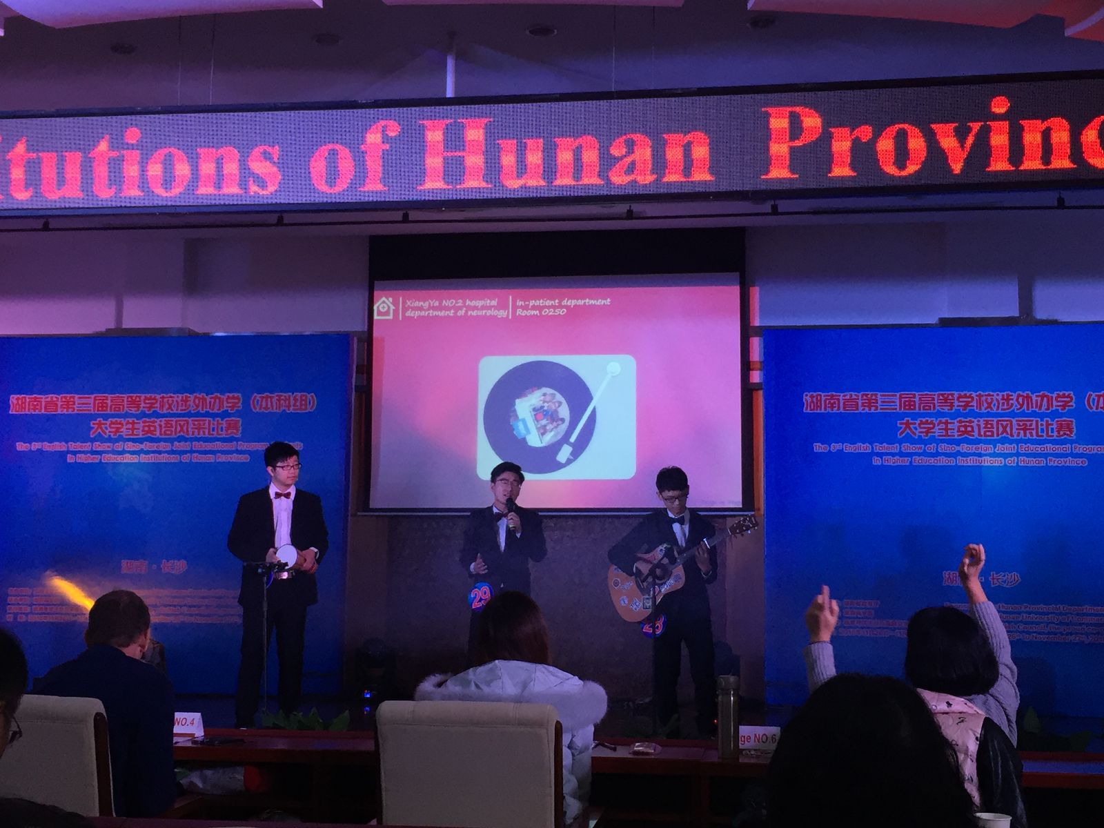 本次大赛由湖南省教育厅举办,旨在提高我省涉外办学项目质量、促进英语教学水平。比赛内容采用小组讨论和才艺展示两个环节,每支参赛队的3名选手与外籍主试官就抽取的文章进行讨论,同时参赛选手每人回答必答题一道,另有抢答题2道,每道题回答时间为3分钟;才艺展示以团队形式结合英语语言的运用上台展示才艺,时间为5-8分钟。小组讨论和才艺展示评分分别占总分的60%和40%,最后根据总分评选出团体奖和个人奖。来自包括中南大学,湘潭大学在内的全省16所高校的17支代表队参加了赛事角逐。1946伟德国际源自英国学生毛劭枫以总分第二的佳绩从51名选手中脱颖而出获得个人一等奖、邹意、吴一舟分获个人三等奖和优胜奖。三位选手还以优异的成绩获得团体三等奖。