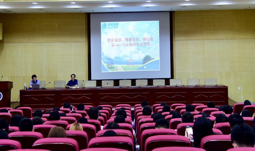 为了帮助我校电气工程及其自动化专业学生全面了解电网企业招聘信息以及提高学生就业应变能力。陆教授主要从四方面做了阐述,首先,对电网现状进行分析,包括国家电网和南方电网的情况都做了详尽说明,并对电网成为热点的原因进行剖析;再次,对电网考试内容一一向同学们做了生动讲解;最后,陆教授强调了准备电网考试的过程、细节和注意事项,叮嘱现场的每位同学,对国家电网和南方电网的选择要提前谋划、精准定位、精心准备,打有准备之战。