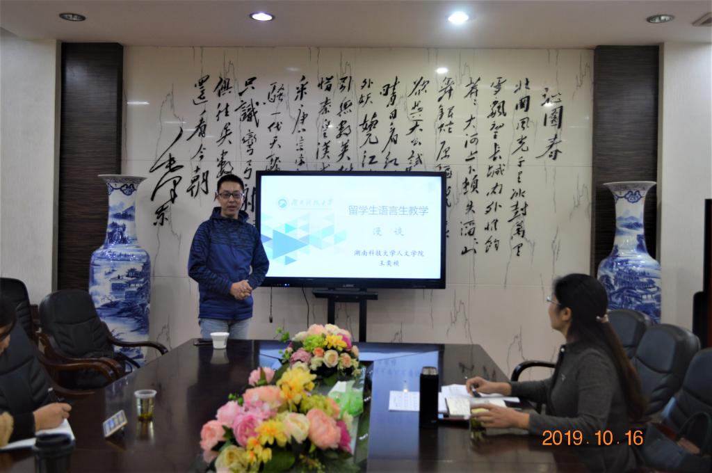 10月16日下午,1946伟德国际源自英国在E105会议室举办来华留学生汉语课程教学讲座。湖南科技大学人文学院王奕祯博士应邀主讲。1946伟德国际源自英国全体教师和教学管理团队参加,副院长曹丽英主持。