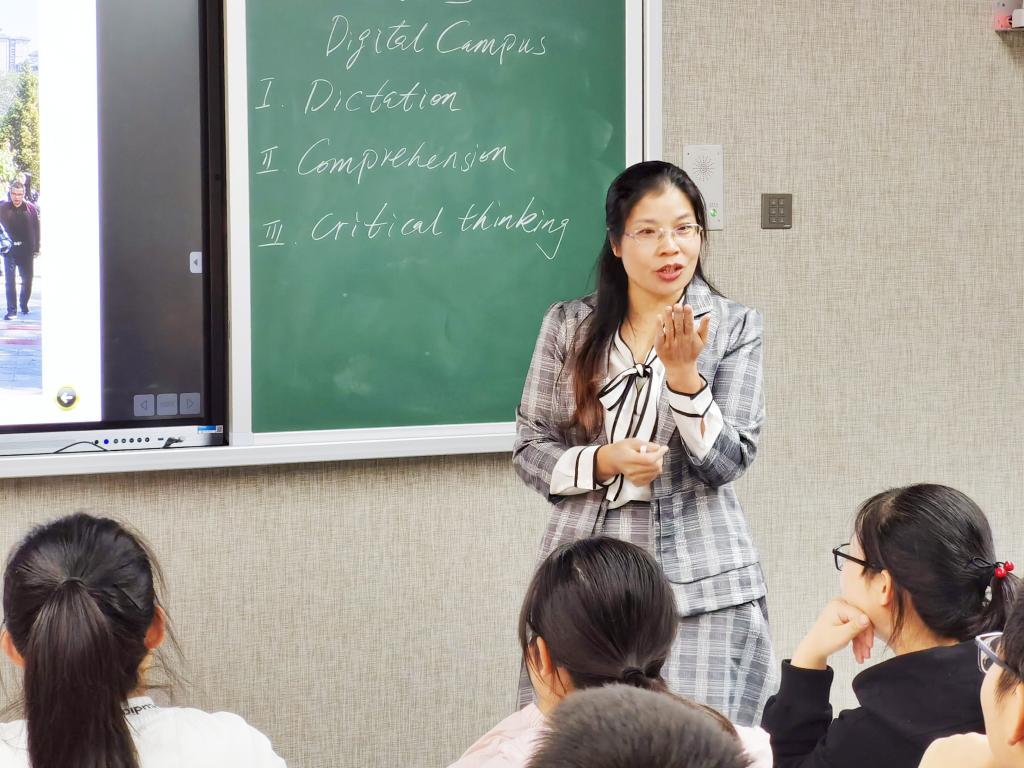 本堂课的主要内容是数字校园(Digital Campus),曹老师巧妙地运用智慧教室与教学主题相结合,紧密贴近实际生活,启发学生思维,让学生积极思考,踊跃发言。课堂上,曹老师语言流畅、大方得体,时而春风化雨,用温柔动听的声音点拨学生;时而严谨专注,用认真负责的态度引领学生;时而循循善诱,拓展学生思维,培养他们独立思考和团队合作的能力;时而风趣幽默,使课堂轻松活跃。