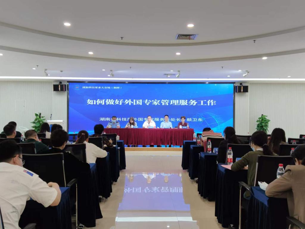 为了进一步提升外国专家来华工作管理服务水平,助力打造我市科技创新人才集聚基地,2022年5月26日上午, 湘潭市科技局在湘潭市岳塘区晓塘路创新大厦举办外国专家服务业务培训班。湖南省科技厅外国专家服务处处长颜卫东、二级调研员李文娟以及湘潭市公安局人口与出入境管理支队副支队长金鑫分别就如何做好外国专家管理服务工作、外国人来华工作许可办理相关注意事项以及出入境证件办理注意事项等内容进行讲授,并现场答疑解惑。我校国际交流中心主任曹丽英应邀带队参加。