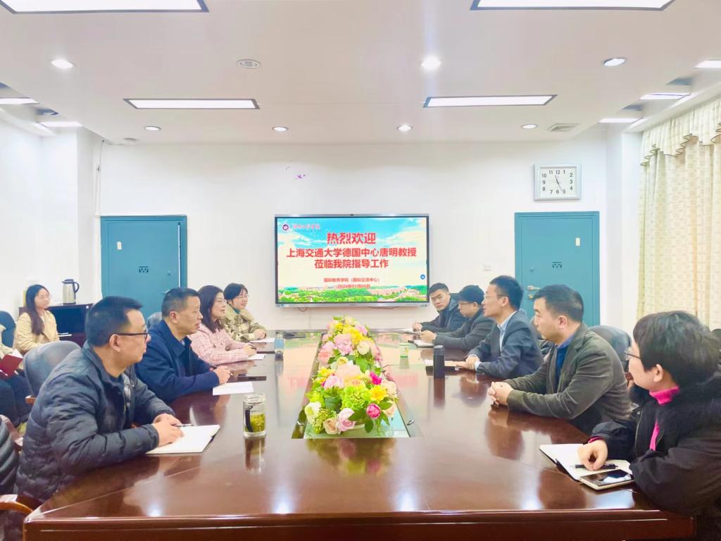 2024月1月5日上午,上海交通大学德国中心副主任唐明教授来我院考察,新工科.新文科建设办公室主任曾赛峰、1946伟德国际源自英国(国际交流中心)领导班子、全体教职工参加座谈,党总支部书记罗胜杰主持。