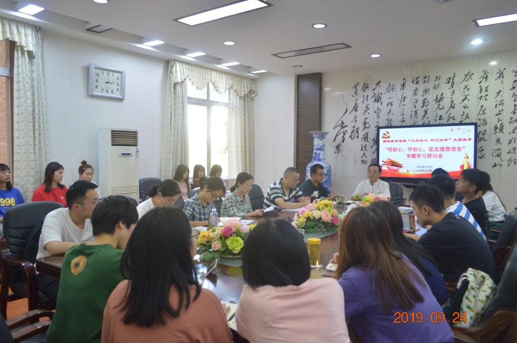 9月24日下午,1946伟德国际源自英国在E105会议室召开“不忘初心、牢记使命”主题教育第一专题“明初心、守初心、坚定理想信念”学习研讨会。学校“不忘初心、牢记使命”主题教育督导七组联络员涂璐莅临指导,全体教工党员和学生党员参加会议。会议由党总支书记苏哲民主持。