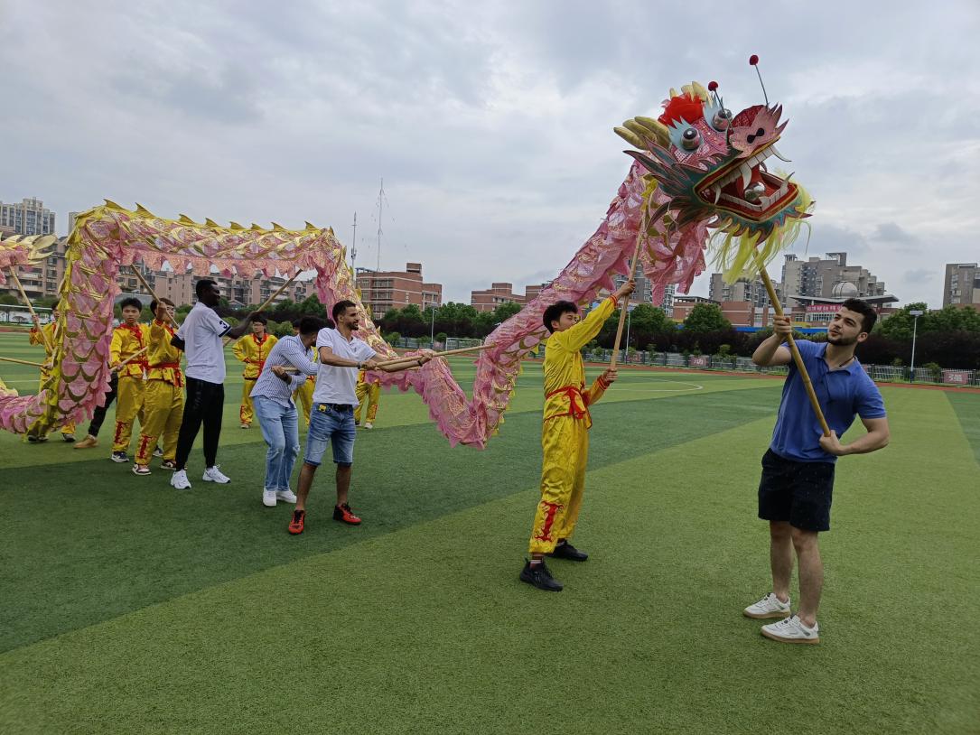 看,那条龙好威风!”6月2日上午,在湘潭医卫职业技术学院的运动场上,道具造型绚丽、构图变化巧妙、动作套路灵活的龙舞表演引得我校留学生们惊叹连连。