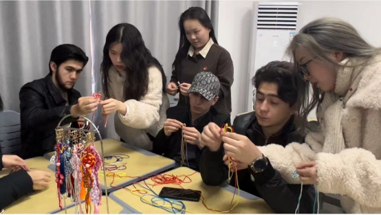 实践环节中,中外学生分组学习编制。一根根红线在大家的手中渐渐被缠绕成形,从生疏到熟练,一个个精巧的中国结跃然指尖。大家激动地互相展示着自己编织的中国结,并不断地感叹着中国古代人民的智慧与灵巧的手艺。中外学生交流就像这中国结,每一根丝绳都可以独立成结,各美其美;不同的丝绳也可以共同编织,美美与共。