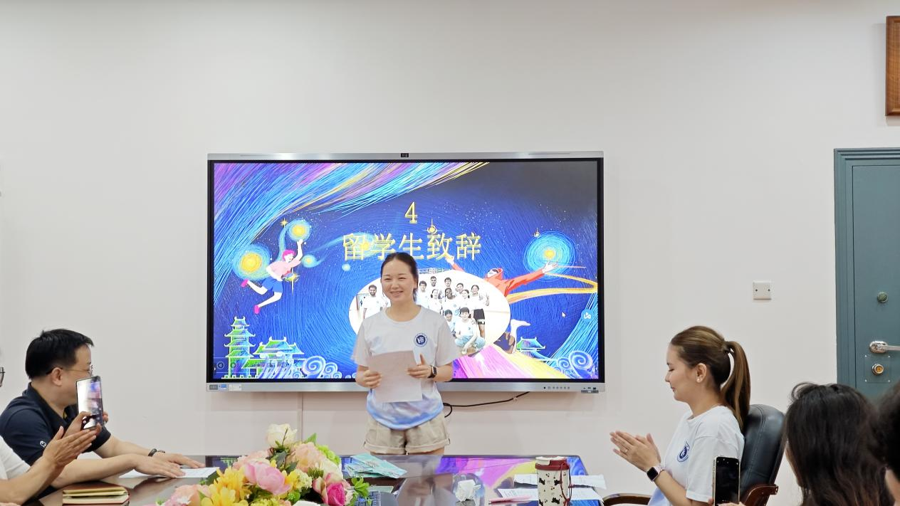 一段精心制作的纪念视频拉开了序幕。镜头里,留学生们初抵湘潭时的青涩模样与如今的自信风采交叠呈现合唱比赛舞台初体验排球赛场上的默契配合,从国画课堂的墨香氤氲到湖南博物院的实地研学,每一个珍贵瞬间都印证着同学们跨越语言障碍、探索中国文化的成长轨迹。
