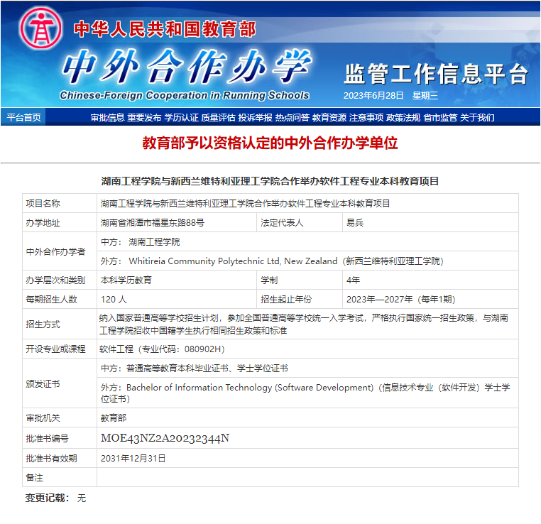 2023年4月22日中国教育部下发项目批准书(批准号:MOE43NZ2A20232344N),批准“伟德bv1946与新西兰维特利亚理工学院合作举办软件工程专业本科教育项目”,该项目采取“4+0”的合作教育模式,学生完成项目人才培养方案规定课程并达到中方学历与学位授予标准后,可获得中方颁发的软件工程专业本科毕业证书、工学学士学位证书。学生毕业前英语水平达到雅思总分6分(单项不低5.5分)或相当水平,还可以获得新方颁发的信息技术专业(软件开发)学士学位证书(Bachelor of Information Technology (Software Development))。
