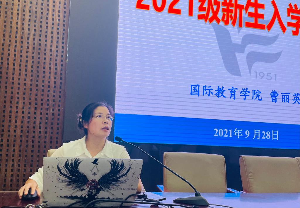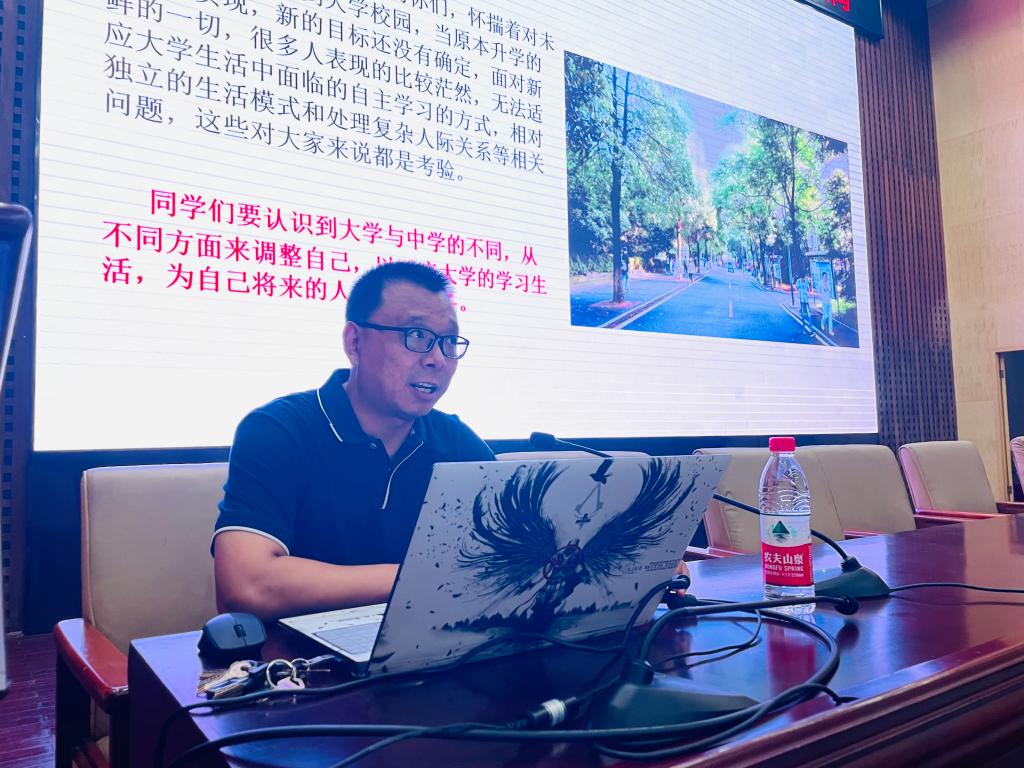 党总支副书记连泰老师首先介绍了学院学生工作队伍的分工、办公地点和联系方式,从安全、学习、生活、健康和资助五个方面全面介绍了大学生活。他提醒同学们要注意人身安全、消防安全和财产安全,注意防范电信诈骗;介绍了学院关于学生学习纪律和学风建设的有关规定,鼓励大家不负青春,有备而行;详细解读了宿舍生活和人际交往中需要关注的要点。连泰希望与会学生能认识到大学与中学的不同,调整自己,适应大学生活,为将来的人生做好准备。